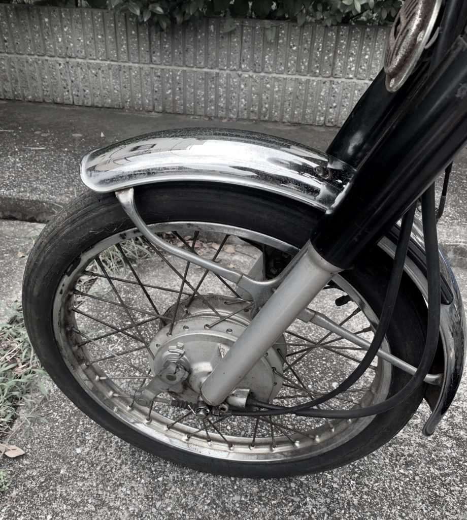 フェンダーのボルトをとったら上にずらしてアクスルシャフトを抜き取ったあとフロントホイールを取り出します。
