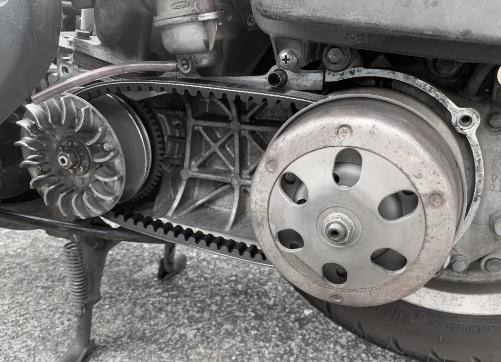 次はクラッチをリアホイールのシャフトへ差し込みますが、Vベルトをクラッチに取り付けてからエンジンに組み付けます。